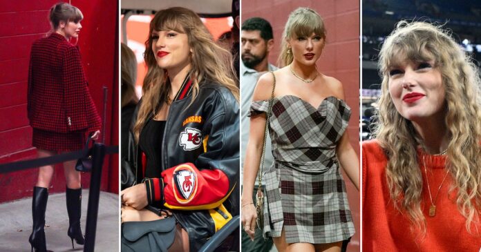 Taylor Swift apoya a Travis Kelce de los Kansas City Chiefs, combinando moda de alta gama con elementos alusivos al equipo en cada partido.