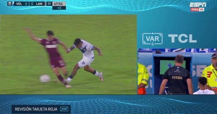 El VAR, a cargo de Germán Delfino, le dio aviso a Fernando Echenique de que la dura entrada del central al experimentado jugador de Lanús era merecedora de roja. Planchazo a la pierna derecha. El juez principal observó la infracción y rectificó su decisión. Anuló la amarilla inicial y lo expulsó.