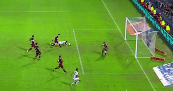 En la acción, que ocurrió a los 33 minutos del segundo tiempo, se ve caer dentro del área a Aquino, justo cuando iba a definir con el arco a su merced. El mediocampista trastabilló y cayó al suelo, reclamando un contacto desde atrás del jugador de Lanús Felipe Peña Biafore.