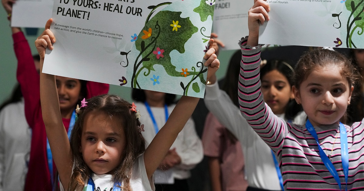 Niños abogan por un planeta limpio durante la Cumbre sobre el Clima COP29 de la ONU, el jueves 21 de noviembre de 2024, en Bakú, Azerbaiyán. (Foto AP/Peter Dejong)
