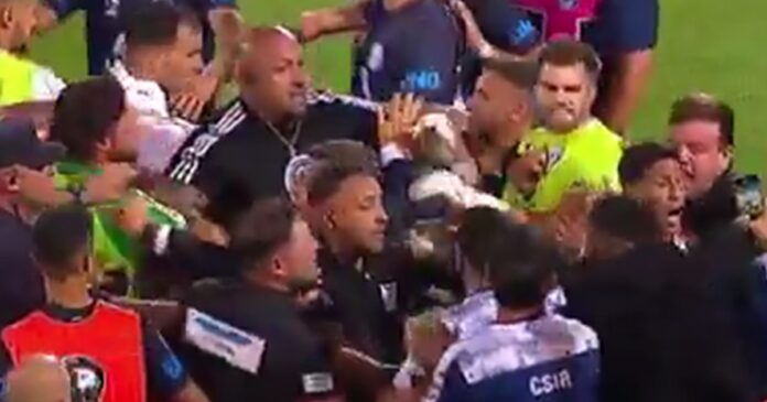 Primero abundaron los reproches cruzados y los amagues. Villa repitió la actitud, haciendo ademanes y la teatralización de la ametralladora. Sus propios compañeros lo empujaron para llevarlo rápidamente a camarines, aunque la mecha ya estaba encendida. Comenzaron los empujones, gritos cara a cara, y a pesar de que los entrenadores (Alfredo Berti y Marcelo Gallardo) intentaron calmar las aguas, no pudieron.