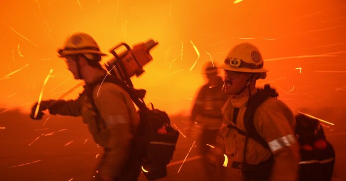 Los bomberos son empujados hacia atrás por fuertes vientos mientras retiran combustible alrededor de las residencias de profesores y personal de la Universidad Pepperdine mientras el incendio Franklin se acerca en Malibú, California, el martes 10 de diciembre de 2024.