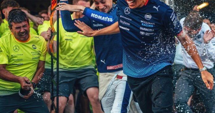 La primera foto fue una de ellos dos esquivando el baño de champagne impulsado por los mecánicos del equipo. El hecho ocurrió en el GP de Bakú, donde ambos habían puntuado gracias a un séptimo puesto del tailandés y al octavo del argentino.