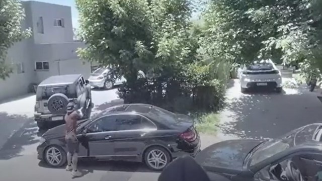 La secuencia comenzó cuando un hombre, que circulaba a bordo de su camioneta 4×4, intentaba salir del barrio privado. Al llegar a una de las esquinas, no pudo avanzar porque se encontró con un Mercedes Benz mal estacionado, lo que derivó en un ataque de furia.