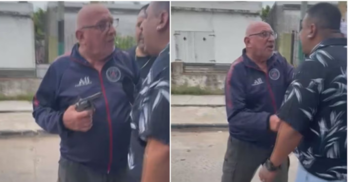 Según relataron testigos, el autor del disparo amenazó a los presentes durante el entredicho. “Vamos a terminar mal”, les habría advertido. De acuerdo a lo que se puede observar en las imágenes, tras entrecruzar algunas palabras con uno de los hombres, Moreno no dudó en sacar el arma que tenía escondida en su cintura, un revólver calibre .38, bajo sus prendas.
