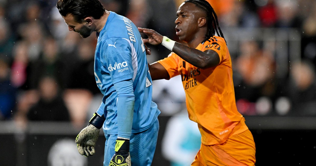 El brasileño se metió en el área con pelota dominada y fue derribado por un rival. Pidió penal, pero no se lo dieron y el guardameta del Valencia se acercó a decirle algo. Esto fue lo que desató la llamativa reacción de Vini, que se levantó del piso y agredió al portero.