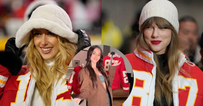 Kristin Juszczyk creó los abrigos de Brittany Mahomes (esposa del jugador Patrick Mahomes) y Taylor Swift (AP/Ed Zurga, Jay Biggerstaff-USA TODAY Sports)