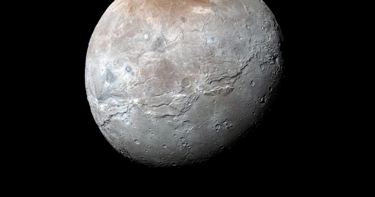 Una vista coloreada de la luna Caronte de Plutón, captada por la nave espacial New Horizons en 2015. (NASA/Johns Hopkins University Applied Physics Laboratory/Southwest Research Institute vía The New York Times)
