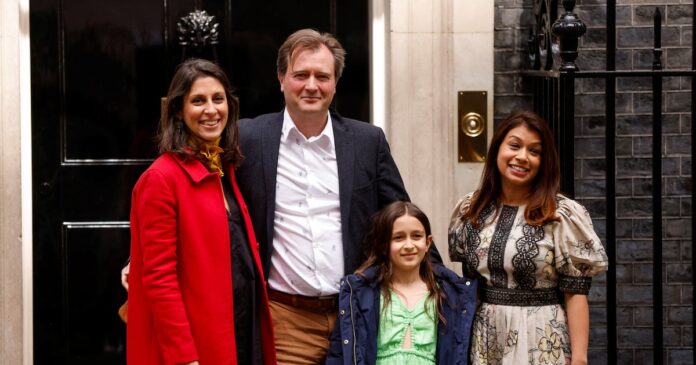 Nazanin Zaghari-Ratcliffe, su esposo Richard Ratcliffe, su hija y la parlamentaria Tulip Siddiq posan para una fotografía afuera de Downing Street en Londres, Gran Bretaña, el 13 de mayo de 2022 (REUTERS/John Sibley)