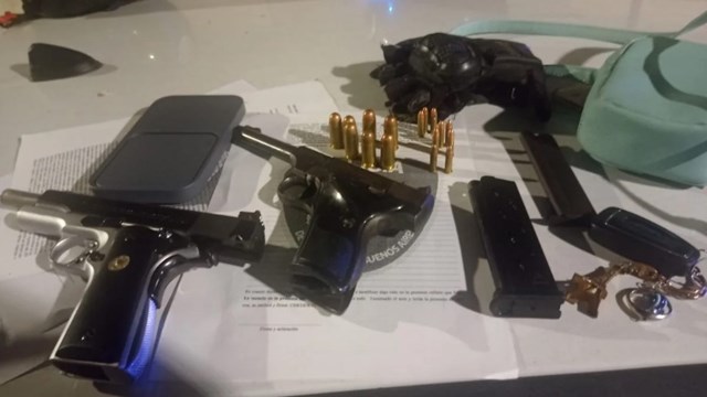 En presencia de testigos, el auto fue requisado y los oficiales encontraron una mochila y en su interior una pistola automática calibre 22 con un cargador con 7 cartuchos de bala, una pistola calibre 45 con un cargador con 9 cartuchos, 8 destornilladores, varios precintos de plástico, dos pinzas, esposas de metal con un juego de llaves, un par de guantes de goma, tres barbijos y prendas de vestir.