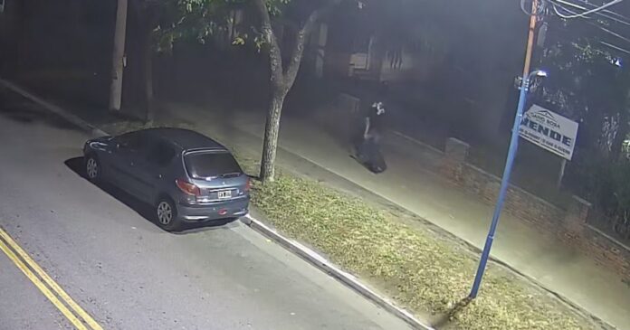 La secuencia no terminó allí. El sospechoso fue grabado por los dispositivos de videovigilancia. Las imágenes lo muestran a pie, mientras carga una valija negra, presuntamente, con los elementos robados a la pareja, que advirtió al 911 del asalto.
