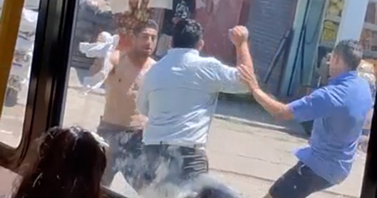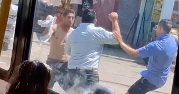 Las imágenes captaron el momento de la riña sobre la vereda. Se observa cómo los colectiveros fueron en dupla contra el joven, que se había quitado la remera. Cuando uno de ellos se dio vuelta, el pasajero que no tenía saldo en la SUBE comenzó a atacar con su cuchillo al otro y a avanzar sobre él, que intentó escapar corriendo hacia atrás al notar el arma blanca, pero trastabilló.