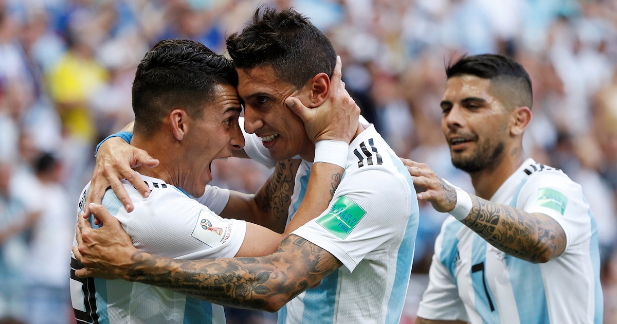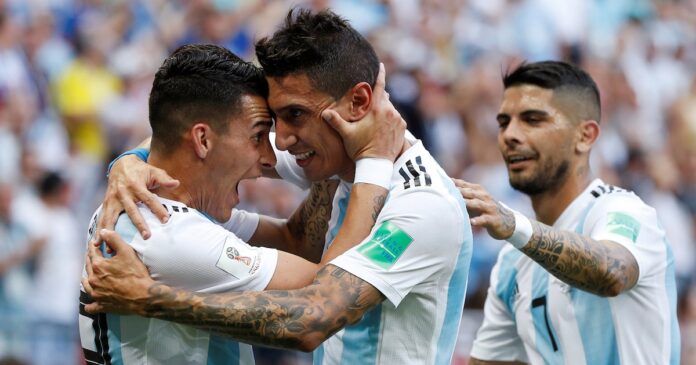 Soccer Football – World Cup – Round of 16 – France vs Argentina – Kazan Arena, Kazan, Russia – June 30, 2018 Argentina’s Angel Di Maria celebrates scoring their first goal with Cristian Pavon and Ever Banega REUTERS/John Sibley