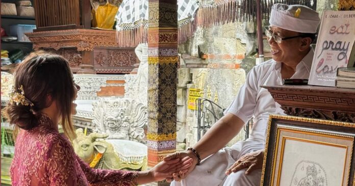 Para retratar ese encuentro, Caniggia subió a su cuenta de Instagram una foto que la muestra de rodillas frente al sabio balinés, en un ambiente cargado de simbolismo. La hija de Claudio Paul Caniggia lució un atuendo tradicional: una camisa de encaje rosa con un lazo fucsia ceñido a la cintura y una falda amarilla, en señal de respeto hacia las costumbres del lugar.