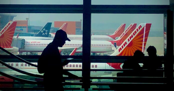 La silueta de un hombre se recorta contra un ventanal, con aviones de Air India de fondo, en Nueva Delhi, India (AP Foto/Manish Swarup)