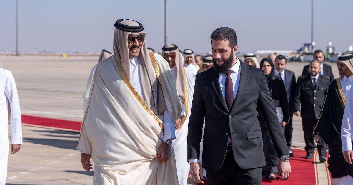 El presidente sirio para una fase de transición, Ahmed al-Sharaa, recibe al emir de Qatar, jeque Tamim bin Hamad Al Thani, en Damasco (Amiri Diwan/via REUTERS)