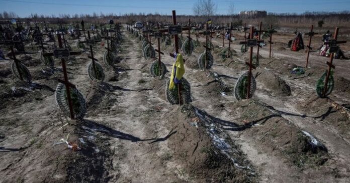 Tumbas de personas no identificadas asesinadas por soldados rusos durante la ocupación de la ciudad de Bucha en el cementerio de la ciudad (REUTERS/Gleb Garanich)