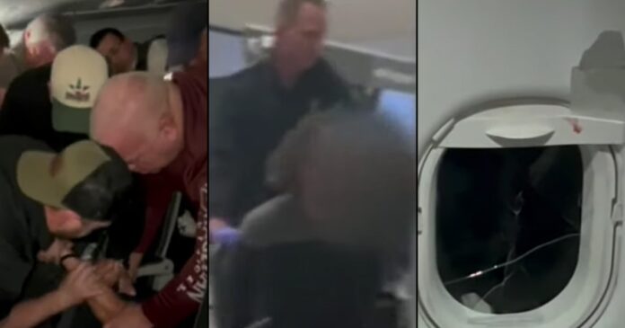 Según relató Tanner Phillips, otro pasajero presente en el vuelo, el hombre “gritaba en varios idiomas, golpeaba la ventana y se recostaba mientras intentaba sacarla de una patearla”.