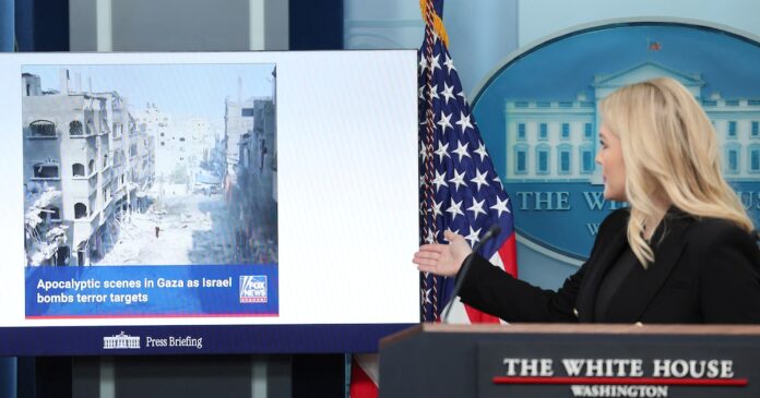 La Secretaria de Prensa de la Casa Blanca, Karoline Leavitt, muestra una imagen de Fox News sobre la cobertura de Gaza durante una sesión informativa en la Casa Blanca en Washington (REUTERS/Leah Millis)