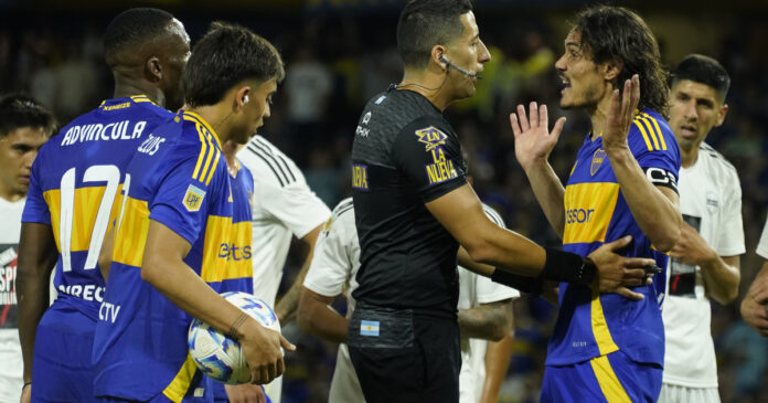 Yael Falcón Pérez y Edinson Cavani, en un Boca – Riestra.