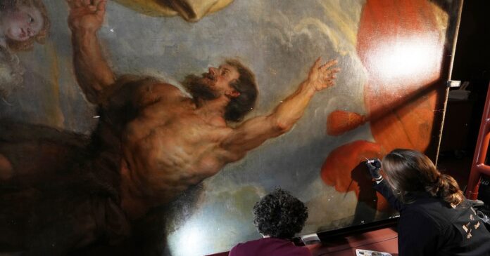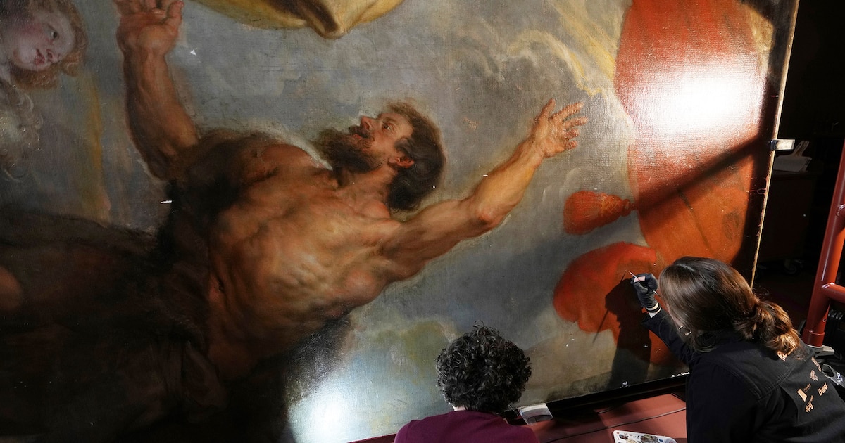 En el caso de una obra monumental del maestro Peter Paul Rubens en la ciudad natal del artista en Bélgica, el taller tuvo que ser trasladado a la pintura. En la sala más grande del Museo Real de Bellas Artes de Amberes, los restauradores tienen los ojos de los visitantes sobre sus espaldas y, a veces, críticas resonando en sus oídos.