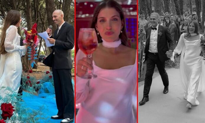 Con todo un escenario y altar armado al aire libre en el bosque de La Reserva, balneario ubicado al sur de Mar del Plata, la novia llegó del brazo con su papá y protagonizó un momento súper emotivo. Fue una ceremonia simple pero muy emotiva, como parte de un íntimo momento que se pudo ver en las redes sociales con los posteos de la familia.