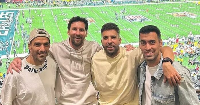 Messi no iba a estar solo, por supuesto. Llegó acompañado de varios de sus compañeros en Inter (y también en Barcelona). Más bien sus amigos: Jordi Alba, Sergio Busquets y Luis Suárez. El capitán de la selección argentina concurrió además con dos de sus hijos, que lucían remeras de Patrick Mahomes, figura de los Chiefs.