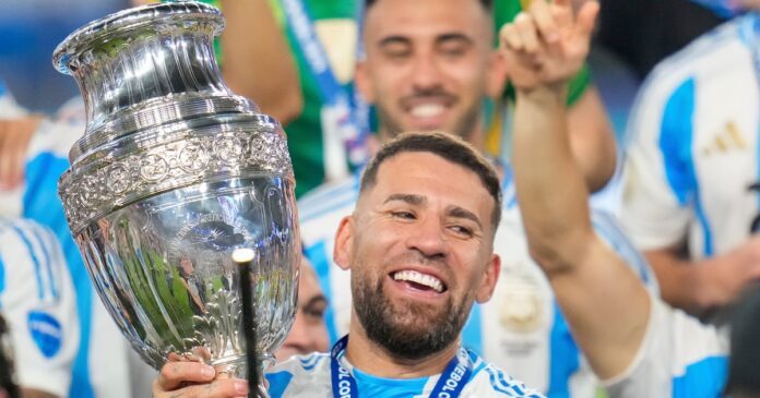 Otamendi, con el trofeo de la Copa América que ganó en 2024 con la selección argentina (AP Foto/Julio Cortez)