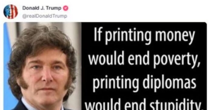 “Si imprimir dinero acabará con la pobreza, imprimir diplomas acabaría con la estupidez”, dice el posteo del mandatario norteamericano, que se leyó como una muestra de respaldo al argentino en medio del escándalo por la criptomoneda.