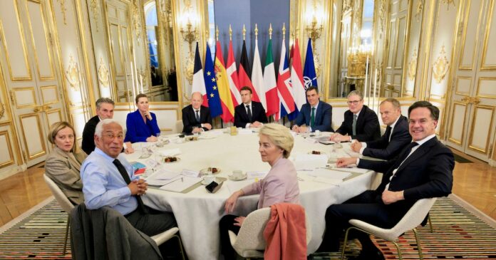 Los principales líderes europeos, como el canciller alemán, Olaf Scholz; el presidente del Gobierno español, Pedro Sánchez (c-d); y los primeros ministros de Países Bajos, Dick Schoof; de Polonia, Donald Tusk, y de Italia, Giorgia Meloni (i), además de los máximos representantes de la UE y de la OTAN (EFE/ Pool Moncloa)