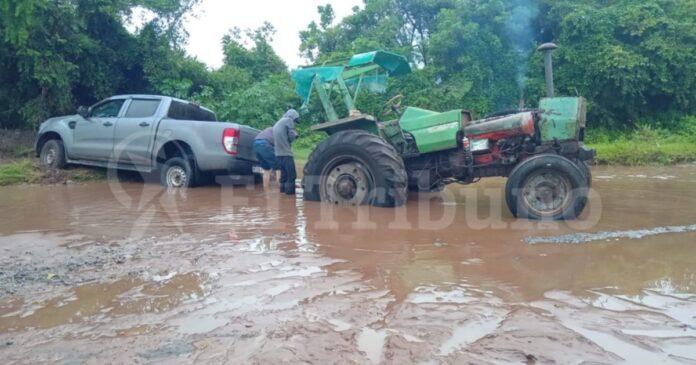 En la mañana de hoy cerca de la zona del paraje Punta de Agua se quedaron dos camionetas, un auto y un tractor. Mientras llovía en la zona colapsaron los sistemas de desagües y el agua, una vez más, comenzó a circular por la ruta que es de ripio y tierra, tornándola intransitable.