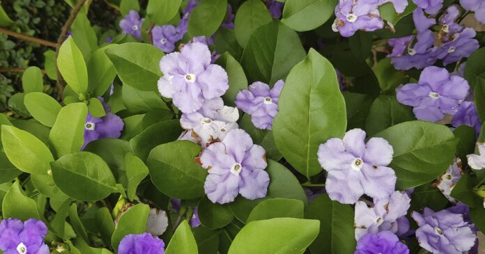 Las flores del jazmín paraguayo tienen una particularidad única: comienzan siendo de color violeta, luego pasan a un tono lila o azul suave, y finalmente se vuelven blancas. Este cambio de color a medida que las flores envejecen es lo que le da su aspecto distintivo, lo que también le ha valido el nombre común “ayer, hoy y mañana”.