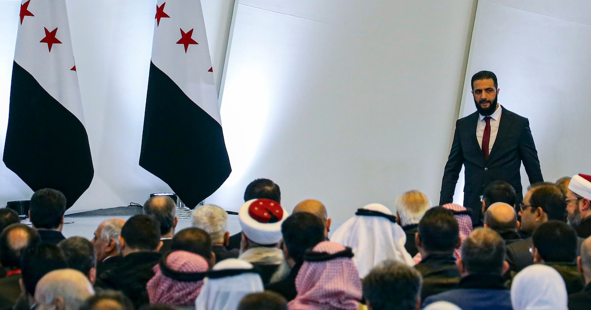 El presidente interino de Siria, Ahmad al-Sharaa (derecha), baja del estrado tras intervenir en la conferencia de diálogo nacional de Sira, en el Palacio del Pueblo de Damasco, Siria, el 25 de febrero de 2025 (AP Foto/Omar Albam)