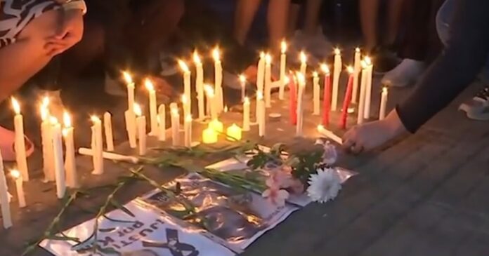 La gente se agolpó sobre la puerta de la sala velatoria, con carteles en alza que exigen Justicia por Kim. Allí encendieron velas ya cuando la noche caía.