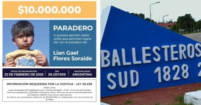 El Gobierno de Córdoba y el Ministerio de Seguridad dispusieron hoy que se entregue una recompensa de 20 millones de pesos para aquellas personas que aporten datos certeros sobre el paradero de Lian Gael Flores Soraide, el nene de tres años que permanece desaparecido desde el sábado.
