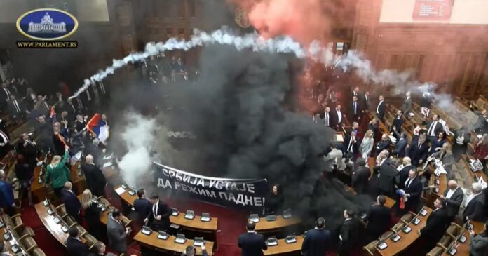 Legisladores de la oposición serbia encendieron bengalas y lanzaron presuntos gases lacrimógenos durante la jornada inaugural de la sesión de primavera del Parlamento, en señal de apoyo a las protestas anticorrupción en curso (AFP)