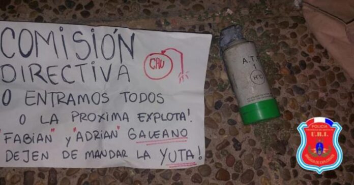 Eran las cinco y media de la mañana cuando un empleado divisó un movimiento sospechoso en la puerta de Unión. Dos personas, con gorras y la cara tapada por un buzo, dejaron un artefacto en la sede del club. De inmediato, se dio aviso a la Policía y el subinspector del área explosivos, Hugo Juncos, llegó al lugar. Por su experiencia, supo que estaba ante una granada de mano de tipo hostigamiento de origen española que tenía puesta la espoleta. Al ver que no había riesgo de que se activara, la división de explosivos la recogió y, debajo, surgió la sorpresa: había una nota escrita a mano para la Comisión Directiva, con una amenaza concreta que involucra a la interna de la barra, que ya lleva un buen tiempo y que tuvo un último episodio a balazos en octubre del año pasado.