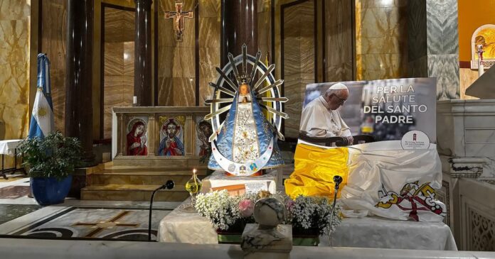 El domingo por la tarde, María Rosa Cavañas encendió una vela frente a una pequeña capilla de la iglesia de Santa María Addolorata -la iglesia nacional de Argentina en Roma-, donde había una foto del Papa Francisco colocada en un estrado junto a una oración por su buena salud. En la pared del fondo de la capilla había una pequeña estatua de Nuestra Señora de Luján, patrona de Argentina, Paraguay y Uruguay, y una oración encomendando a Francisco a su cuidado.