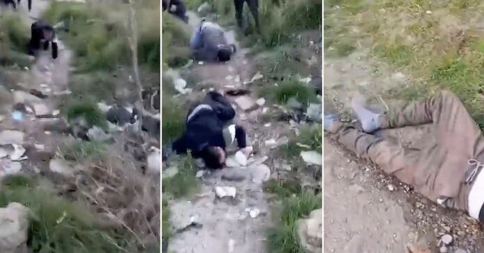 En otro clip, hombres vestidos con uniforme militar parecieron ordenar a tres personas que se arrastraran por el suelo uno detrás del otro antes de abrir fuego contra ellos a corta distancia.