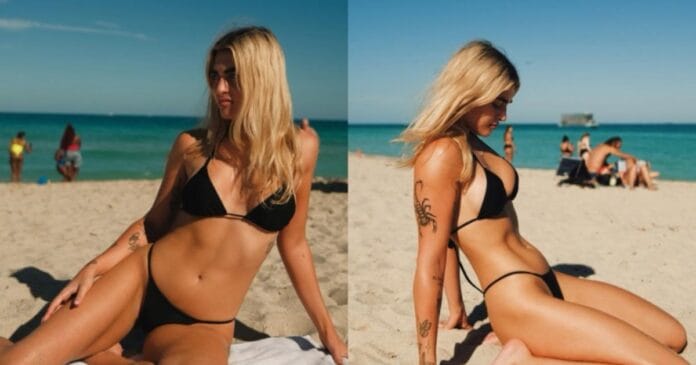 En una reciente imagen capturada en la famosa Miami Beach, Marta Fort posa relajadamente en la arena, mientras disfruta de un día soleado. La foto muestra a la hija del empresario Ricardo Fort con un look casual y atractivo: un bikini negro que resalta su figura y una postura tranquila, con una pierna doblada y la otra extendida. Su rostro, ligeramente inclinado hacia la cámara, transmite una mezcla de serenidad y seriedad, creando un contraste interesante con el entorno relajado.