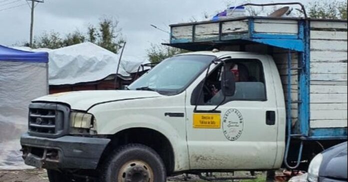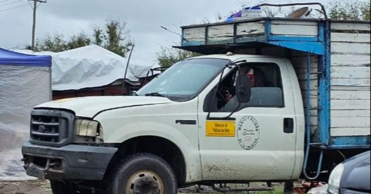 La imagen tomada por un vecino de Ciudad del Milagro muestra el momento exacto en el que el camión, visiblemente deteriorado pero con el logo del municipio de La Caldera, estaciona para dejar mercadería a los puestos y a la feria que se instala en la zona durante los fines de semana.