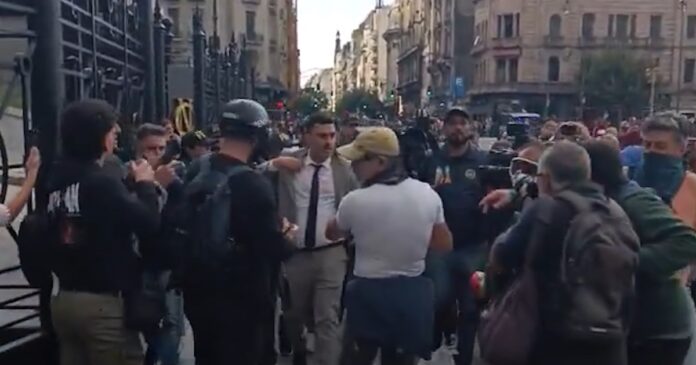 El equipo de Todo Noticias (TN), a cargo de Manuel Jove, llegó al lugar pasadas las 17, pero no pudo completar su trabajo debido a las agresiones. El periodista fue increpado y rodeado por un grupo de manifestantes, que le impidieron transmitir en vivo. “Estoy acá laburando”, intentó defenderse Jove, mientras lo empujaban y le lanzaban insultos. En medio de la tensión, efectivos policiales lo escoltaron para alejarlo del foco de conflicto. Más tarde, cuando intentó retomar la cobertura, volvió a ser atacado.
