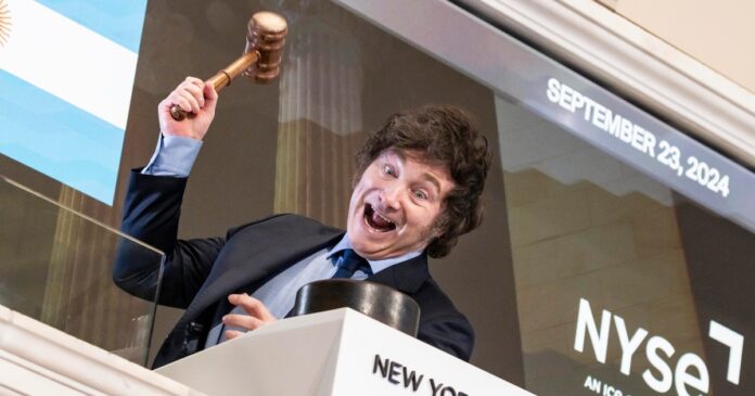 El presidente Javier Milei en la Bolsa de Valores de Nueva York (NYSE) para tocar la campana de apertura en Nueva York (EEUU), en septiembre pasado (EFE/EPA/Justin Lane)