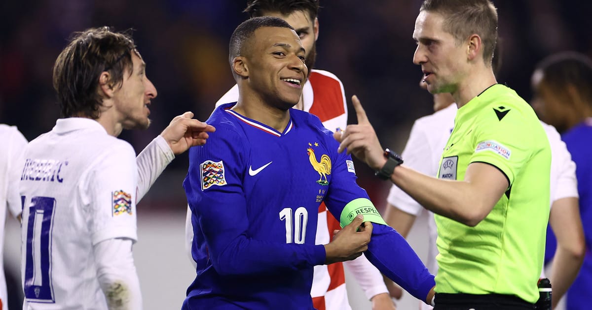 France's forward #10 Kylian Mbappe (C), Croatia's midfielder #10 Luka Modric (L) and Norwegian referee Espen Eskas (R) react during the UEFA Nations League quarter-final first-leg football match between Croatia and France at the Poljud Stadium in Split, on March 20, 2025. (Photo by FRANCK FIFE / AFP)