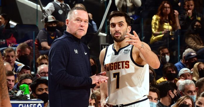 Michael Malone junto a Facundo Campazzo durante la etapa del argentino en Denver Nuggets, en 2022 (Getty Images via AFP)