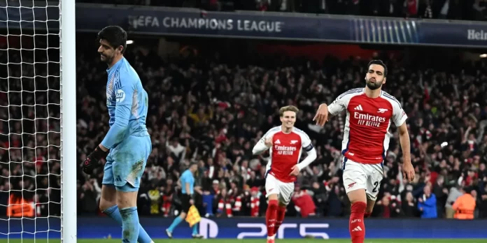 El arquero del Real Madrid, Thibaut Courtois, fue decisivo durante el primer tiempo, evitando que los remates de Declan Rice y Gabriel Martinelli se convirtieran en goles.