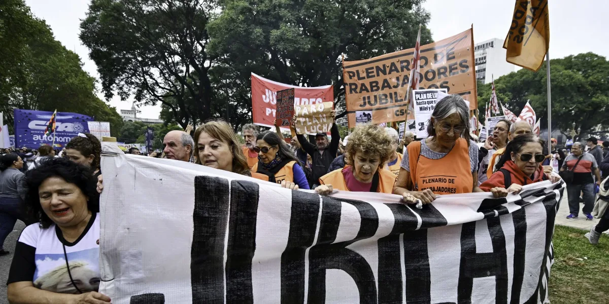 La manifestación, habitual cada semana, cobró especial relevancia este 9 de abril por estar acompañada por la Confederación General del Trabajo (CGT) y las dos centrales de la CTA, en la antesala del paro general de 36 horas convocado por el movimiento obrero.