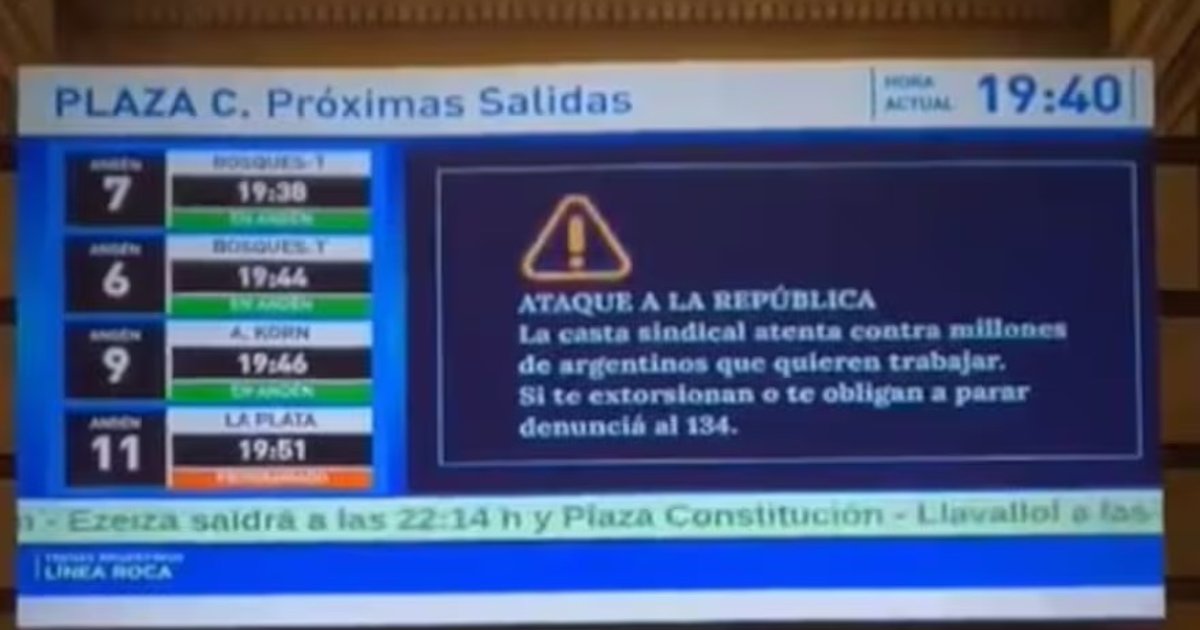 Según supo Noticias Argentinas, la pieza audiovisual pudo verse en pantallas de estaciones ferroviarias del AMBA, en un intento del Gobierno por instalar su postura crítica frente al paro nacional de 24 horas que comenzó a las 00:00 de este jueves.