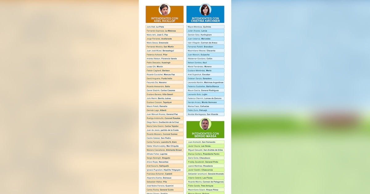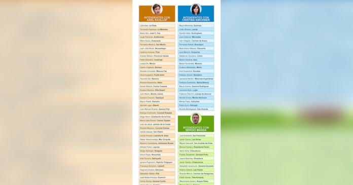 Ese grupo de intendentes cuenta entre sus filas a algunos que gobiernan municipios importantes en materia electoral como Fernando Espinoza de La Matanza, Fernando Moreira de San Martín, Andrés Watson de Florencio Varela, Jorge Ferraresi de Avellaneda o Julio Alak de La Plata. Pero también hay un fuerte despliegue por el interior bonaerense, con representantes en las secciones electorales que están por fuera del área metropolitana. Si bien el peso electoral de estos distritos es notablemente menor a la influencia del conurbano, sí ofrece una alternativa para el armado de las listas o al menos la representación que Kicillof pueda llegar a tener en la Legislatura bonaerense a partir de diciembre de este año.