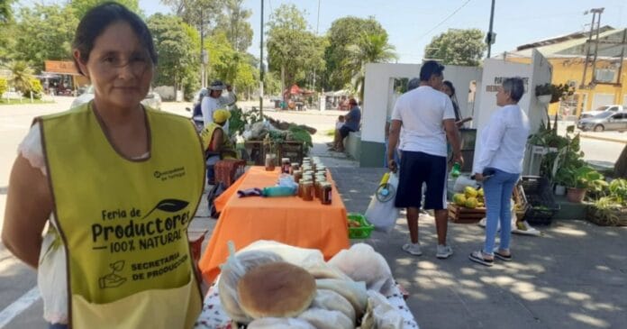 Emprendedores ofrecen productos en la feria semanal.